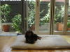 それらを洗濯する時に、マットをカバーを換えて、いつもとは違うバルコニーの前に置いてみた。