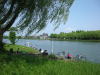 つりをする人たち、川では、カヌーを漕ぐ人もいる。