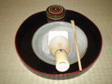 9、帛紗は左手で握りこみ、右手で茶筅を取り、茶碗の右上に置く。