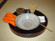 28、茶碗を右手で取り、左手で扱って回し、右方向に正面を向けて出す。