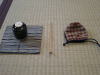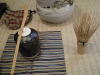 11、続いて水指の上の茶筅を右手で取って、茶入の右に置き合わせる。