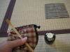 6、仕覆の緒をとき(といたら横にし、左手で打留をもち、向こう、手前と紐をゆるめ、正面で右、左と手をそわせ、底を持ち)脱がせ、茶入を茶碗と膝前の間に置き、両手で仕覆の形をととのえ、右手で仕覆の右横を持ち、左へ打ち返して(底は上)、打留を客付きに向けて、右手で風炉と水指の中間向こう寄りに置く。