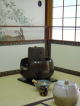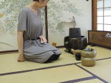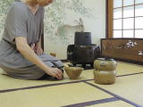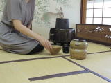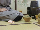 30、茶碗を右手で取り左掌にのせ、正面を正し、定座にに出します。(炉畳)
