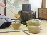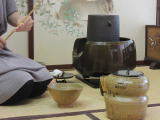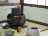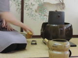 6、やはり右斜めに座って、風炉の右横斜め、炉の点前の時に棗、茶筅を置く位置に、同時に置きます。(釜の鐶と水指の耳を結んだライン)