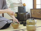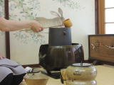 42、湯を汲み、茶碗に入れ、柄杓を釜にあずける。左手で茶碗を取り、湯を建水にあけます。