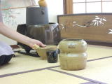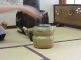 7、水屋に下がって建水を左手に持ち、席に入り、茶道口を閉めます。点前座に進み、水指正面、水指の中央をねらって座ります。(釜の前に蓋置を置くことを考えて置く位置に注意する)