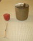 45、茶筅を棗の横に置き、茶碗を右手で取り、水を建水に捨て、茶巾を右手で取って、茶碗に入れ、茶筅を茶碗に入れる。